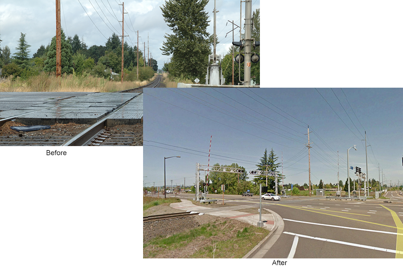 Project scope involved coordination of road and rail crossing design between the railroad, ODOT, ODOT Rail and the City Engineers. This involved a number of meetings and design iterations to determine the proper configuration and layout to provide for safe movement of vehicles, trains and pedestrians.