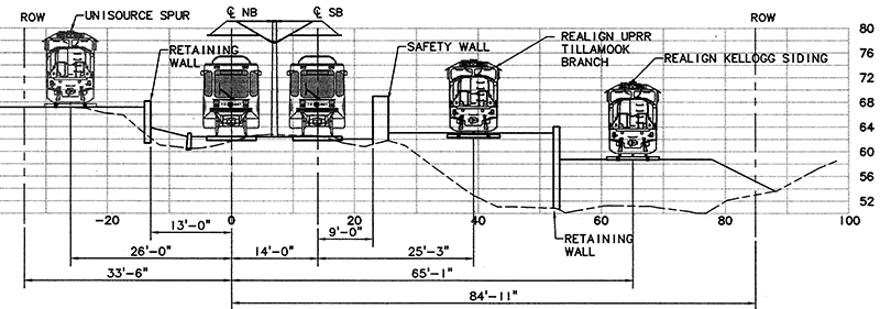The existing Tillamook line was shifted west to allow for the two light rail lines to cross over and parallel the Tillamook main. This required the industrial lead on the east to be shifted north and east of the light rail overpass and the Kellogg Industrial park spurs to the west to be shifted west and adjusted vertically. The complicating factor was the vertical grades into the Industrial Park dropped away sharply to the west. The 30% design involved coordination with UPRR and the Willamette & Pacific Railroad. In addition, WRE was responsible for review and coordination of at-grade crossings, barrier wall and quiet zones.